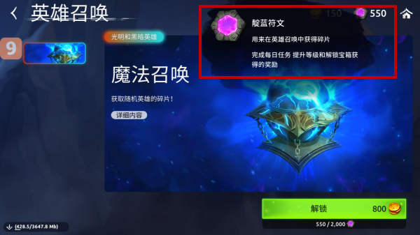 4、使用在每日任务或者其他途径获得的靛蓝符文解锁就可以抽取英雄碎片了