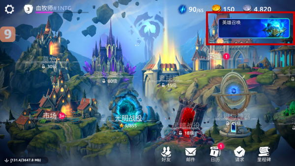 1、下载好游戏后,点击进入游戏主页面,点击右上角的‘英雄召唤'